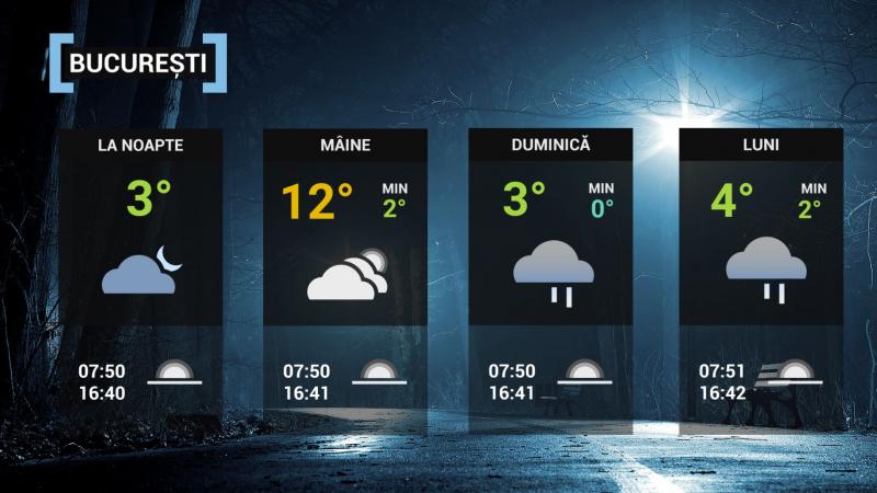 La noapte, cerul va fi variabil, iar vântul va sufla moderat, temporar cu unele intensificări ce vor atinge viteze de până la 40...45 km/h. Temperatura minimă mult mai ridicată comparativ cu noaptea precedentă, va fi de 1...3 grade.