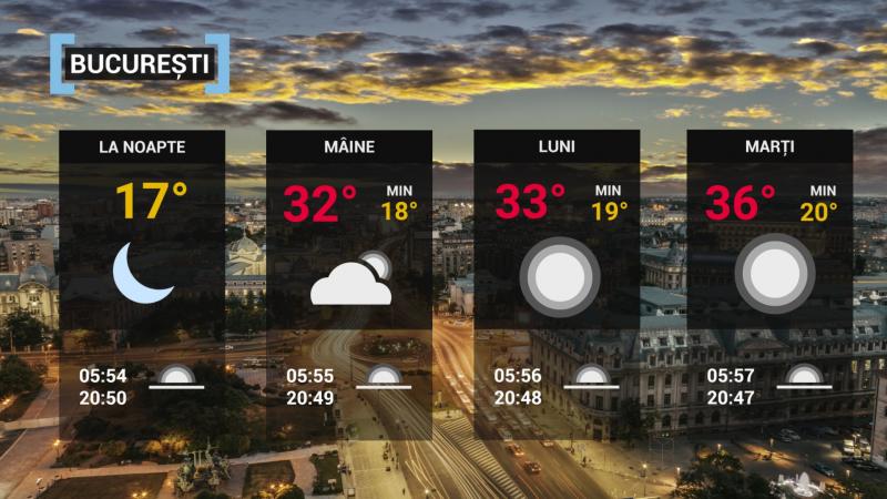 La noapte, cerul va fi mai mult senin, iar vântul va sufla în general slab. Temperatura minimă va fi de 15...17 grade.