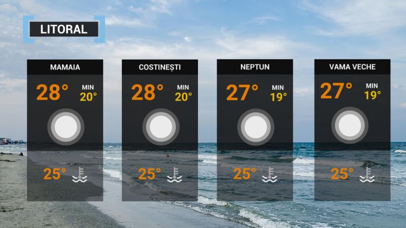 Vremea va fi predominant frumosă. Cerul va fi mai mult senin, iar vântul va sufla slab şi moderat, cu intensificări trecătoare ziua. Temperaturile maxime se vor încadra între 27 şi 29 de grade, iar cele minime între 19 şi 22 de grade. Temperatura apei mării va avea valori cuprinse între 24 şi 26 de grade.