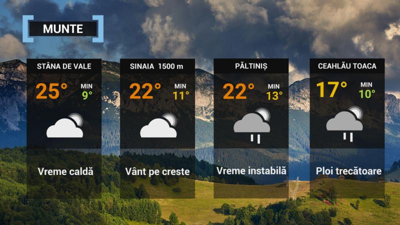 Vremea va deveni călduroasă, iar disconfortul termic va fi resimţit în unele regiuni. Cerul va fi variabil, cu unele înnorări după-amiaza la munte, iar spre seară şi noaptea în vest şi nord-vest.
