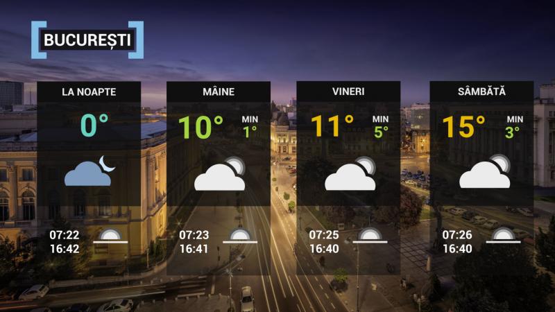 La noapte, cerul va fi variabil, iar vântul va sufla în general slab. Temperatura minimă se va situa în jurul a 0 grade. Spre dimineaţă vor fi condiţii de ceaţă.