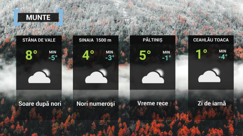 Valorile termice vor creşte uşor faţă de ziua anterioară, astfel că vremea va fi normală termic pentru această perioadă. Cerul va fi variabil, cu unele înnorări în masivele sud-vestice. Vântul va sufla slab şi moderat, cu intensificări în Munţii Banatului şi în zona Carpaţilor Meridionali, unde vitezele vor fi mai mari în cursul nopţii. Dimineaţa şi noaptea, pe văi şi în depresiuni se va forma ceaţă.