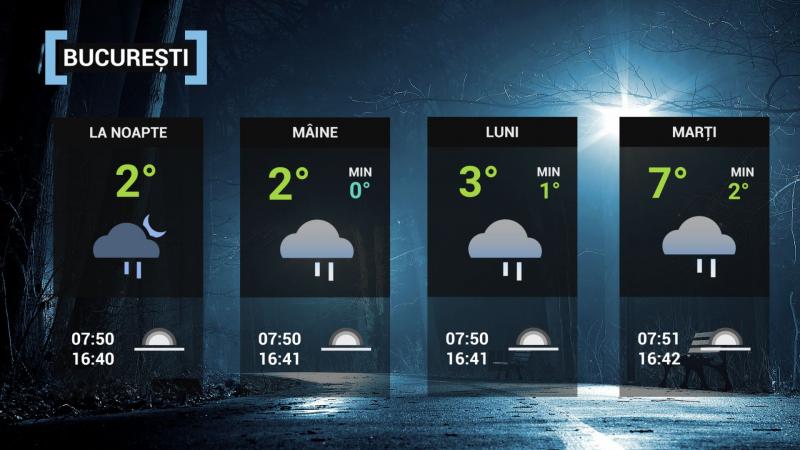 La noapte, cerul va avea înnorări, iar spre sfârşitul intervalului va creşte probabilitatea pentru ploi slabe. Vântul va sufla slab şi moderat. Temperatura minimă va fi de 0...2 grade.