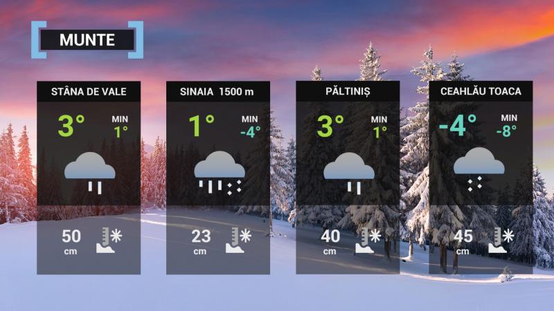 Vremea va fi în general închisă. Cerul va fi noros şi vor fi precipitaţii predominant sub formă de ninsoare în Carpaţii Orientali şi la altitudini mari în restul grupelor montane, iar la altitudini mai scăzute vor fi ploi şi lapoviţă. Cantităţile de apă vor depăşi pe arii restrânse 15...20 l/mp. Vântul va sufla slab şi moderat, cu intensificări locale, mai ales în a doua parte a intervalului, pe crestele Carpaţilor Meridionali. Izolat va fi polei. Valorile de temperatură nu vor avea variaţii semnificative faţă de intervalul precedent.