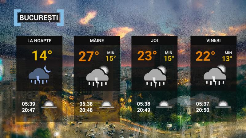 Vremea va fi instabilă. Vor fi înnorări temporar accentuate, averse, frecvente descărcări electrice şi izolat grindină. Ploile vor avea şi caracter torenţial şi, pe alocuri, se vor înregistra cantităţi de apă ce vor depăşi 25...30 l/mp. Local, vântul va avea intensificări, cu viteze mai mari pe crestele Carpaţilor Meridionali, unde rafalele vor depăşi 80...90 km/h. Valorile termice nu vor avea variaţii semnificative faţă de ziua anterioară si se vor situa, în general, în jurul normelor perioadei.