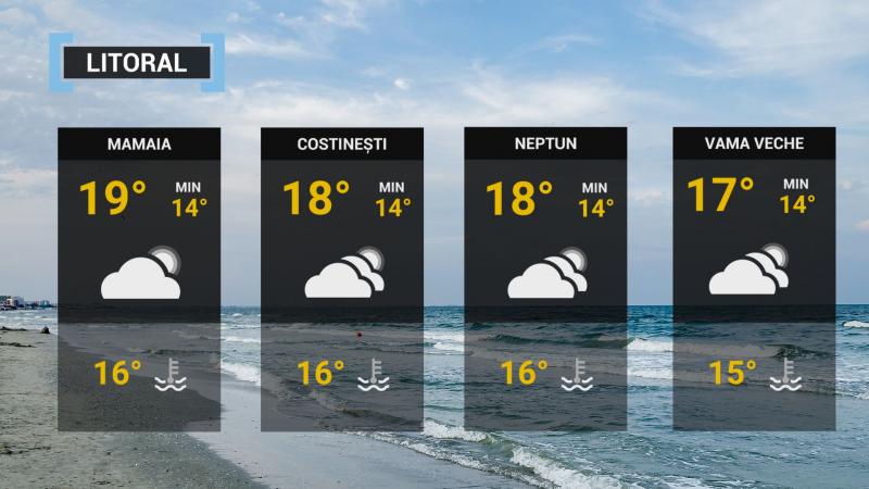 Vremea va fi schimbătoare ca aspect, relativ normală termic. Cerul va fi variabil, temporar mai noros spre seară şi noaptea. Trecător, în a doua parte a nopţii vor fi averse şi descărcări electrice. Vântul va sufla slab şi moderat, cu uşoare intensificări după-amiaza. Temperaturile maxime vor fi cuprinse între 17 şi 21 de grade, iar cele minime vor fi de 14-15 grade. Temperatura apei mării va avea valori de 15...17 grade.