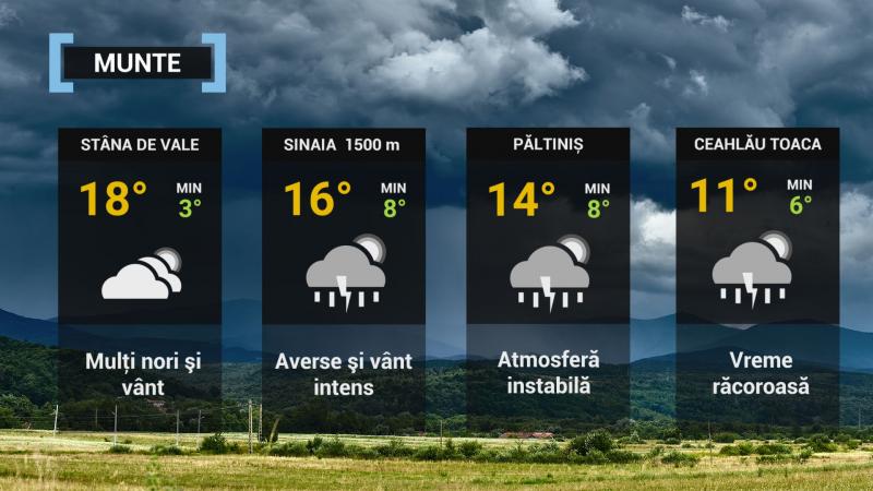 Vremea va fi în general instabilă. Cerul va fi variabil, cu înnorări temporar accentuate, averse şi descărcări electrice în sud-vest, centru, nord şi nord-est, local în sud şi izolat în rest. Ploile vor avea şi caracter torenţial şi izolat se va semnala grindină. Cantităţile de apă vor depăşi pe alocuri 20...30 l/mp, cu precădere în zonele montane. Vântul va avea intensificări la munte, cu viteze mai mari în Carpaţii Meridionali, unde rafalele vor depãşi 80...90 km/h la altitudinile mari, iar de scurtă durată şi în timpul ploilor. Temperaturile minime vor fi cuprinse, în general, între 10 şi 16 grade. Pe suprafeţe mici vor fi condiţii de ceaţă.