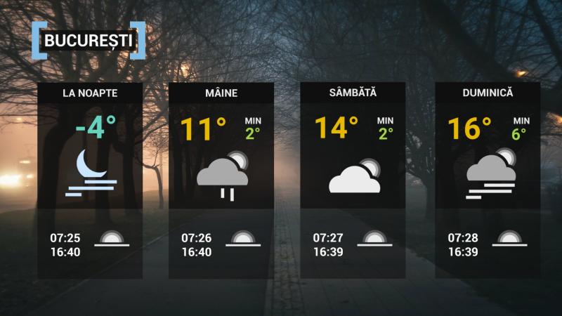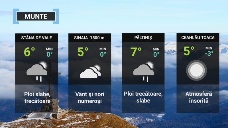 Noaptea înnorările vor fi temporare, iar ploile locale. La munte, la altitudini de peste 1700 m temporar vor fi şi precipitaţii sub formă de lapoviţă şi ninsoare şi posibil polei. În tot intervalul, cantităţile de apă vor depăşi izolat 15...20 l/mp. Vântul va avea intensificări pe creste, în special pe cele ale Carpaţilor Meridionali, unde rafalele vor depăşi 85...95 km/h. Local şi temporar, intensificări ale vântului vor fi şi în restul teritoriului, dar la viteze mai mici. Temperaturile maxime se vor încadra între 4 şi 14 grade, iar cele minime vor fi cuprinse între 0 şi 10 grade, mai scăzute în estul Transilvaniei, până în jurul a -2 grade. Pe alocuri, dimineaţa şi noaptea, se va forma ceaţă. Presiunea atmosferică va scadea dinspre nord-vest la valori joase, de regim ciclonic.
