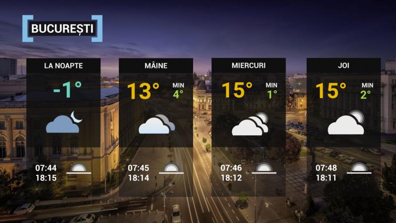 La noapte, vremea va fi rece, cu o temperatură minimă de 1...2 grade, mai scăzută în zona periurbană spre -1 grad. Cerul va fi senin, dar spre dimineaţă se va acoperi cu nori de nivel jos. Vântul va sufla slab până la moderat.