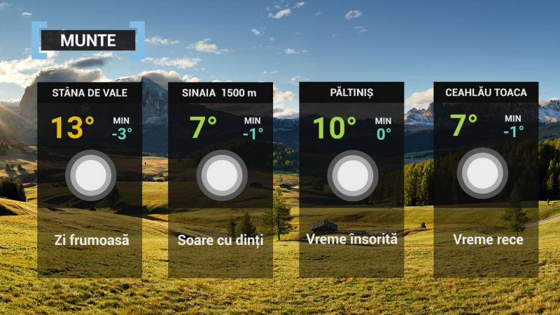 Vremea va fi frumoasă, dar rece în special dimineaţa şi noaptea. Cerul va fi mai mult senin, iar vântul va sufla slab şi moderat, cu intensificări pe crestele Carpaţilor Meridionali. Dimineaţa şi noaptea, pe vãi şi în depresiuni se va semnala ceaţă. Variaţiile termice faţă de ziua anterioară vor fi nesemnificative.