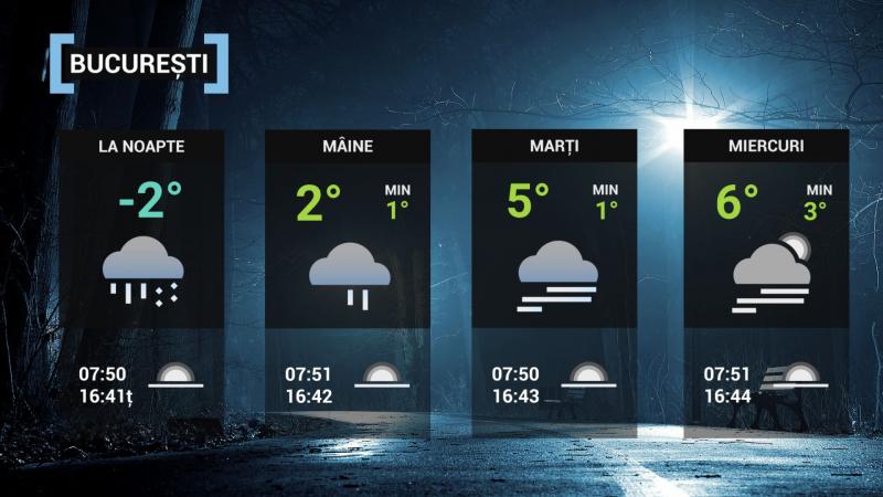 La noapte, cerul va fi noros, iar local şi temporar se vor semnala precipitaţii în cea mai mare parte a ţării. Vor fi mai ales ploi, exceptând zona Moldovei unde vor predomina ninsorile. La munte, la altitudini mai mici de 1600 m, în Carpaţii Occidentali şi în grupele vestice ale Carpaţilor Meridionali precipitaţiile vor fi mai ales sub formă de ploaie şi lapoviţă şi vor determina topirea şi cedarea apei din stratul de zăpadă, iar la altitudini de peste 1800 m vor predomina ninsorile.