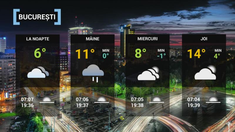 La noapte, vremea se va rãci semnificativ, astfel cã valorile termice se vor situa sub cele caracteristice pentru sfârşitul lunii martie. Cerul va fi mai mult noros şi doar trecãtor va ploua slab. Vântul va sufla în general moderat. Temperatura maximã va fi de 9...11 grade, iar cea minimã de -3...0 grade. Spre sfârşitul intervalului vor fi condiţii de brumã.