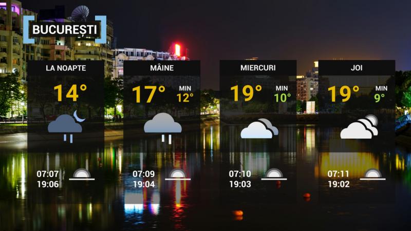 La noapte, înnorările se vor extinde în cea mai mare parte a ţării. Vor fi ploi, mai ales sub formă de aversă, pe arii relativ extinse în Banat şi Crişana, local în Transilvania, pe arii mai restrânse în Oltenia şi Muntenia şi izolat în rest, însoţite şi de descărcări electrice în regiunile vestice. Vântul va sufla slab şi moderat, posibil cu intensificări trecătoare în timpul ploilor. Temperaturile minime, mai ridicate decât în mod normal, vor fi cuprinse între 7 şi 16 grade. Pe spaţii mici, se va semnala ceaţă.