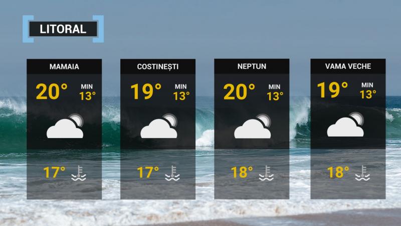 Vremea va fi schimbãtoare ca aspect şi se va răci. Temperaturile maxime vor fi cuprinse între 16 şi 18 de grade, iar cele minime vor fi de 12 ? 13 grade. Cerul va fi temporar noros şi vor fi condiţii pentru ploi slabe. Vântul va sufla slab şi moderat, cu intensificãri trecãtoare. Temperatura apei mării va avea valori de 16...19 de grade.