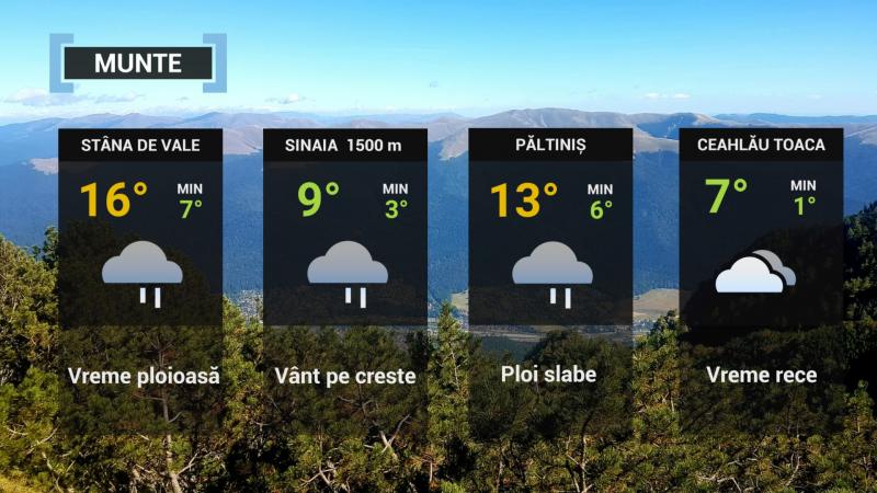 Vremea va fi predominant închisă şi se va răci faţă de intervalul precedent, mai accentuat în masivele sudice şi estice. Va ploua local în Carpaţii Meridionali şi Occidentali şi pe arii restrânse în rest. Ploile vor avea şi caracter de aversă, iar cu totul izolat vor fi posibile descărcări electrice. Cantităţile de apă vor depăşi punctiform 10...15 l/mp. Vântul va avea uşoare intensificări.