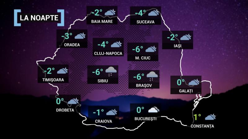 La noapte, cerul va fi temporar noros şi se vor semnala precipitaţii sub formã de ninsoare la munte şi pe arii restrânse predominant sub formã de ninsoare în zonele mai joase de relief. Vântul va sufla slab şi moderat, cu intensificãri în Moldova, local în Oltenia, Transilvania şi Dobrogea, vitezele urmând a atinge în general 45...60 km/h, dar mai ales la munte, la altitudini de peste 1500 m în Carpaţii Meridionali, de Curburã şi în Munţii Apuseni, unde rafalele vor depãşi 80...100 km/h, va fi viscol intens şi vizibilitate scãzutã.