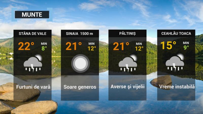 La noapte, cerul va fi variabil, cu înnorări, şi vor fi intensificări ale vântului ce mai pot lua aspect de vijelie, descărcări electrice, averse şi posibil grindină, mai ales la începutul intervalului, local în regiunile estice şi pe arii restrânse la munte, în centrul şi sud-estul teritoriului. Temperaturile minime vor fi cuprinse între 12 grade în depresiuni şi 25 de grade pe litoral.