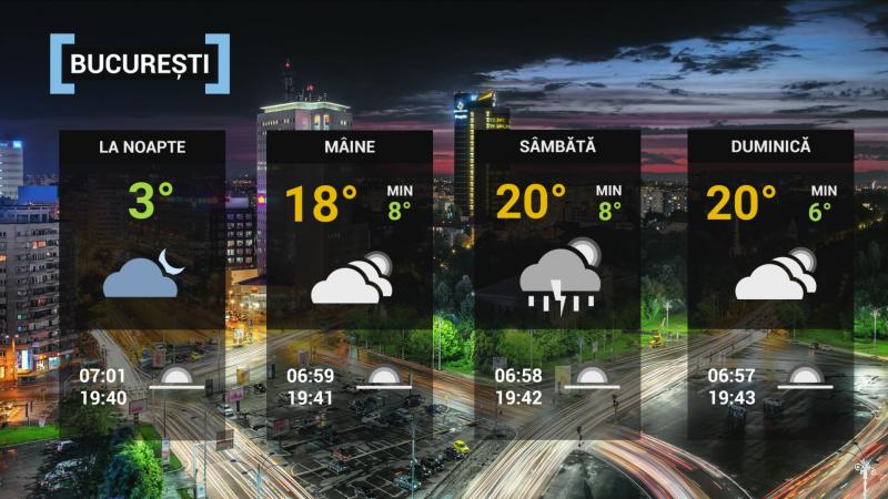 La noapte, cerul va fi variabil, cu unele înnorãri spre sfârşitul nopţii, când vor fi condiţii sã plouã slab. Vântul va sufla slab şi moderat. Temperatura minimã va fi de 0...3 grade.