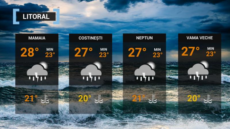 Vremea va fi în general instabilă şi normală termic. Disconfortul termic se va menţine ridicat, iar indicele temperatură - umezeală (ITU) va atinge, local, pragul critic de 80 de unităţi. Cerul va fi variabil, temporar noros după-amiaza şi noaptea, când, vor fi averse, descărcări electrice şi condiţii de grindină. Vântul va sufla slab şi moderat, cu intensificări asociate averselor. Temperaturile maxime se vor încadra între 27 şi 29 de grade, iar cele minime vor fi de 22...23 de grade. Temperatura apei mării va fi cuprinsă între 20 şi 25 de grade.