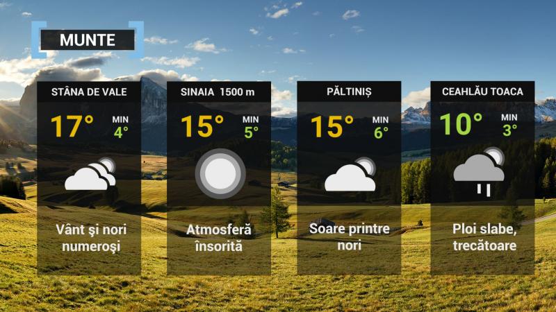Vremea va fi rece dimineaţa şi noaptea, dar la amiază temperaturile vor fi mai ridicate faţă de intervalul anterior. Cerul va fi variabil, cu unele înnorări mai ales în a doua parte a zilei şi noaptea în Carpaţii Orientali unde, trecător va ploua. Vântul va sufla slab şi moderat cu intensificări la altitudini mai mari. Izolat, dimineaţa şi noaptea pe văi şi în depresiuni va fi ceaţă.