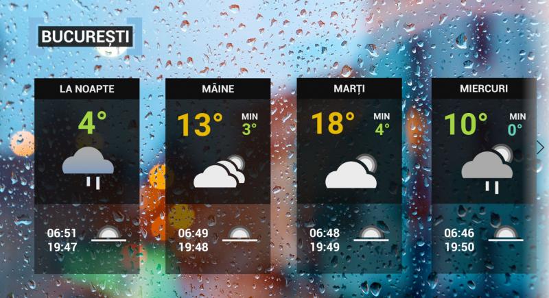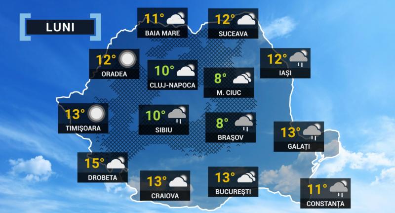 În noaptea de duminică spre luni, cerul va fi mai mult noros şi temporar va mai ploua. Vântul va sufla slab pânã la moderat. Temperatura minimã va fi de 4...5 grade.