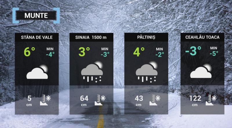 Vântul va sufla slab şi moderat, cu uşoare intensificări pe crestele montane. Temperaturile minime vor fi cuprinse între -4 şi 5 grade. În special în jumătatea nordică a teritoriului, pe suprafeţe mici se va produce brumă.