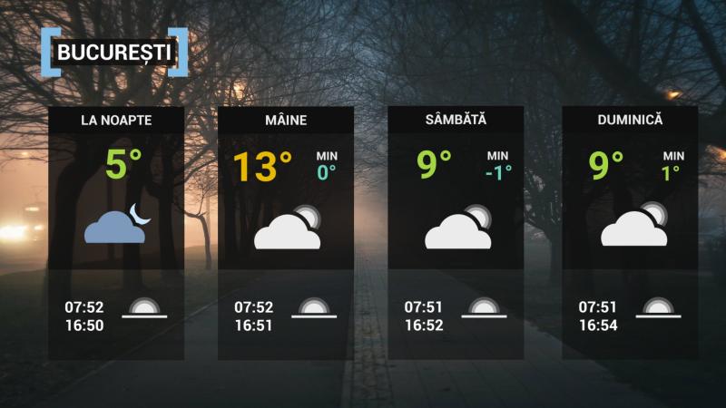 La noapte, cerul va fi variabil, iar vântul va sufla moderat. Temperatura minimã va fi de 3...5 grade.
