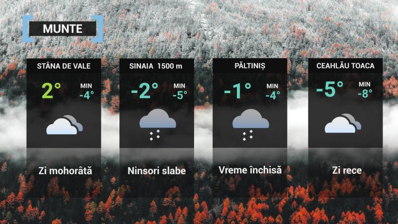 Cerul va avea înnorãri şi local vor fi precipitaţii predominant sub formã de ninsoare. Vântul va sufla slab şi moderat cu intensificãri în prima parte a intervalului, cu rafale de 70...90 km/h, iar la altitudini mari, cu precãdere în Carpaţii Meridionali va sufla tare cu peste 100...120 km/h şi temporar ninsorile vor fi viscolite. Temperatura aerului va fi în scãdere mai ales în masivele nordice, dar valorile se vor menţine peste normele perioadei.