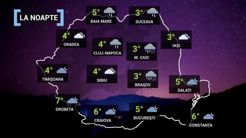 La noapte, vremea va fi vântoasă în majoritatea regiunilor, dar mai ales la munte, unde vor fi rafale de 70...90 km/h, iar în zona înaltã va sufla tare cu peste 100...120 km/h. În zonele joase de relief vor fi viteze în general de 45...70 km/h. Cerul va fi mai mult noros în jumãtatea nordicã a teritoriului, unde pe arii restrânse temporar va ploua, exceptând depresiunile din estul Transilvaniei unde vor fi şi precipitaţii sub formã de lapoviţã şi ninsoare. La munte, local şi temporar va ninge viscolit, condiţii în care vizibilitatea va fi scãzutã. În restul ţãrii, cerul va fi variabil. Temperaturile minime se vor încadra între 0 şi 7 grade.