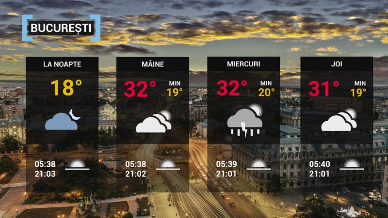Vremea va fi cãlduroasã, disconfortul termic în creştere, iar indicele temperaturã-umezealã (ITU) va putea atinge pragul critic de 80 de unitãţi. Cerul va fi variabil, temporar cu înnorãri dupã-amiaza şi seara, când vor fi condiţii pentru averse, descãrcãri electrice şi intensificãri de scurtã duratã ale vântului. Temperatura maximã va fi de 31...32 de grade, iar cea minimã de 18...19 grade.