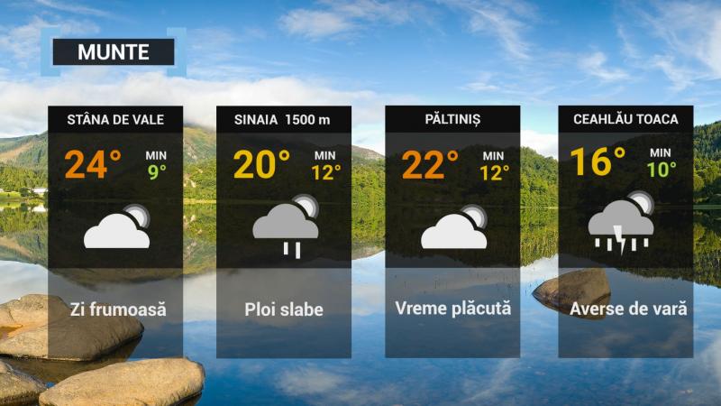 Cerul va fi variabil, cu înnorãri temporar accentuate dupã-amiaza şi seara, când local în Carpaţii Orientali şi izolat în restul zonei montane se vor semnala averse şi descãrcãri electrice. Ploile vor avea şi caracter torenţial, pe arii restrânse se pot acumula cantitãţi însemnate de apã şi vor fi condiţii de grindinã. Vântul va sufla slab şi moderat cu unele intensificãri la altitudini mari, iar de scurtã duratã şi asociat averselor.