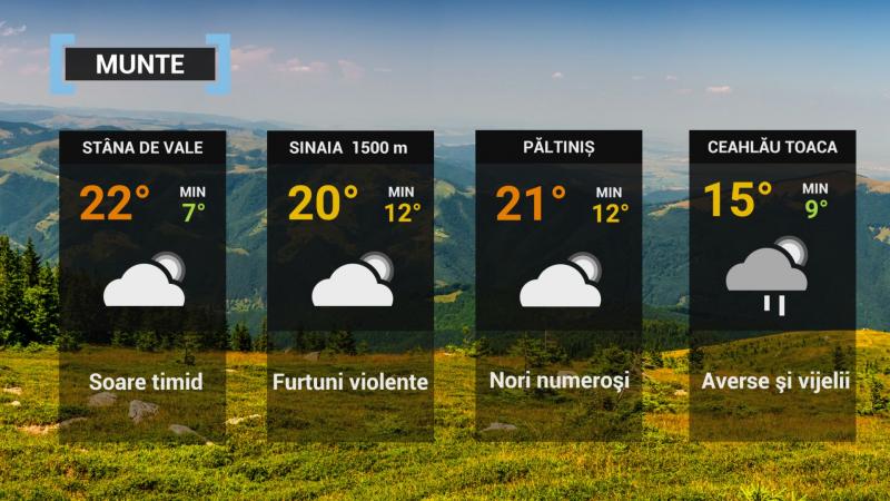 Valorile termice diurne vor fi în creştere uşoară, dar se vor menţine agreabile în majoritatea zonelor. Cerul va fi variabil, cu unele înnorări şi izolat averse şi descărcări electrice, la începutul intervalului pe litoral, iar după-amiaza, cu o probabilitate mai mare la munte. Vântul va sufla slab şi moderat, cu unele intensificări pe crestele montane, iar ziua şi în Dobrogea. Temperaturile maxime se vor încadra între 25 şi 34 de grade, cu cele mai ridicate valori în vestul şi sudul Olteniei, iar cele minime vor fi cuprinse între 10 şi 20 de grade, mai scăzute în estul Transilvaniei spre 7 grade. Dimineaţa şi noaptea, mai ales pe văi şi în depresiuni, izolat, se va forma ceaţă. Presiunea atmosferică va creşte în sudul, centrul şi estul ţării.