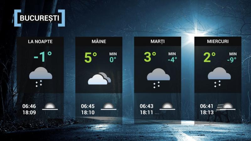 La noapte, cerul va fi noros şi se vor semnala precipitaţii mixte în Banat şi în Crişana, mai ales ninsori în Oltenia, Muntenia şi Dobrogea şi doar ninsori la munte, local în Transilvania şi izolat în celelalte regiuni. Vântul va sufla slab şi moderat, cu uşoare intensificări pe litoral şi în sudul Banatului. Temperaturile minime vor fi cuprinse între -7 şi 1 grad.