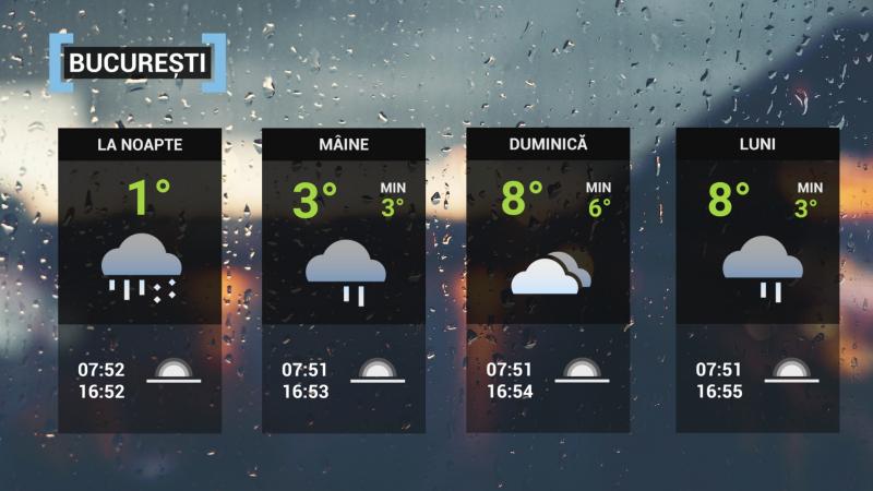 Vremea va fi predominant închisă şi temporar vor fi precipitaţii în cea mai mare parte a ţării. În Banat, Crişana, Maramureş şi în vestul şi nord-vestul Transilvaniei vor predomina ninsorile şi se va depune strat de zăpadă, în dealurile Olteniei şi ale Munteniei si pe arii restrânse în restul Transilvaniei vor fi precipitaţii mixte, iar în celelalte zone, local vor fi mai ales ploi.