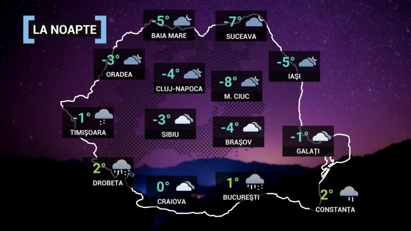 La noapte, cerul va avea înnorări în cea mai mare parte a ţării şi se vor semnala precipitaţii - predominant ninsori în vest şi doar izolat în centru, mixte pe arii restrânse în sud, iar la munte local va ninge. Vântul va avea intensificări în special pe crestele Carpaţilor Meridionali şi ale Munţilor Banatului unde zăpada va fi temporar viscolită. Temperaturile minime se vor încadra în general între -7 şi 2 grade. Pe spaţii mici vor fi condiţii de polei, iar spre sfârşitul intervalului şi de ceaţă.