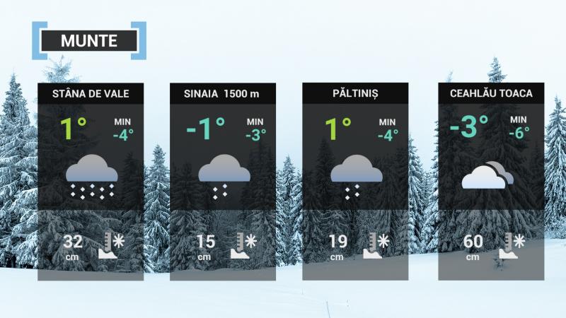 În Carpaţii Occidentali şi în vestul Carpaţilor Meridionali va ninge moderat, iar stratul nou de zăpadă va fi local consistent. Cantităţile de apă vor fi în general de 10...15 l/mp şi izolat de peste 20 l/mp. Pe arii restrânse se va produce polei sau gheţuş. Vântul va avea intensificări cu viteze în general de 55...65 km/h în sudul Banatului şi pe crestele Carpaţilor Meridionali, temporar viscolind ninsoarea, dar pe spaţii mici şi în sud şi est. Temperaturile maxime vor fi cuprinse între 0 şi 9 grade, iar cele minime în general între -1 şi 6 grade. Izolat va fi ceaţă. Presiunea atmosferică va scădea.