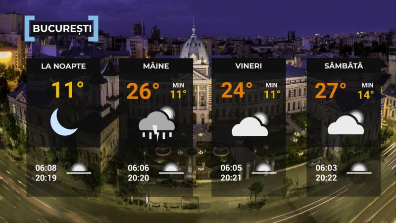 Vremea va fi uşor mai caldã decât în mod caracteristic datei. Cerul va fi variabil, cu înnorãri temporar accentuate dupã-amiaza şi seara când vor fi averse şi descãrcãri electrice. Vântul va sufla slab şi moderat, cu intensificãri de scurtã duratã în timpul ploilor. Temperatura maximã se va situa în jurul valorii de 25 de grade, iar cea minimã va fi de 10...11 grade, uşor mai scãzutã în zona preorãşeneascã. Presiunea atmosferică va fi uşor variabilã ziua, apoi va creşte.
