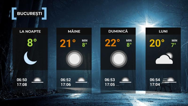 Vremea va fi frumoasã şi deosebit de caldã. Cerul va fi mai mult senin, exceptând a doua parte a nopţii când vor fi nori joşi şi ceaţã. Vântul va sufla slab pânã la moderat. Temperatura maximã va fi de 20...21 de grade, iar cea minimã de 7...8 grade, uşor mai scãzutã în zona preorãşeneascã.