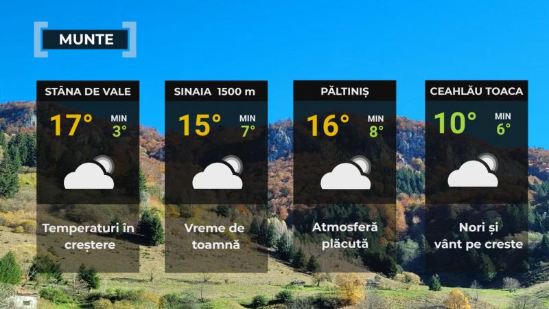 Vremea va fi predominant frumoasã şi deosebit de caldã pentru prima zi a lunii noiembrie. Cerul va fi variabil la senin, iar vântul va sufla slab şi moderat, cu uşoare intensificãri în masivele sud-vestice.