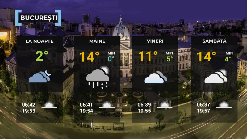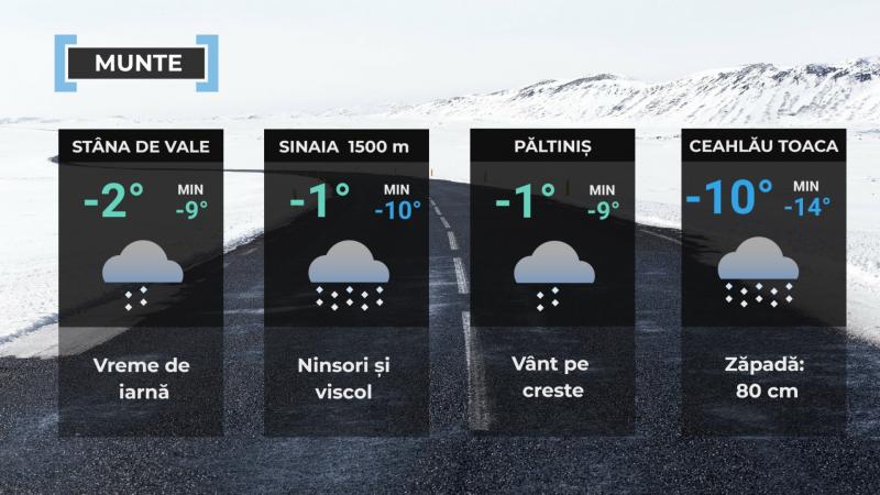 Vremea va fi vântoasã şi se va menţine rece, chiar deosebit de rece pentru aceastã perioadã mai ales în jumãtatea de nord a ţãrii. Pe parcursul zilei, cerul se va înnora dinspre nord în toatã ţara şi vor fi precipitaţii temporare. În Maramureş, nordul şi estul Transilvaniei şi mare parte a Moldovei vor fi mai ales ninsori şi lapoviţã, pe suprafeţe restrânse se va depune strat de zãpadã (în general de 5...10 cm) şi trecãtor va fi viscol. În restul Transilvaniei, în Crişana, estul Munteniei şi Dobrogea vor fi precipitaţii mixte, iar în celelalte zone vor predomina ploile. La munte va fi viscol puternic, vizibilitatea va fi foarte redusã, sub 50 m, şi se va depune strat nou de zãpadã (în medie de 10...20 cm). Vântul va avea intensificãri în toate regiunile, cu rafale de 50...70 km/h şi pe areale mai restrânse 70...90 km/h, iar în zona montanã va sufla tare (viteze de 70...85 km/h şi de 85...120 km/h la altitudini mari). Noaptea aria precipitaţiilor se va restrânge, cerul va deveni parţial noros, iar vântul va diminua considerabil în mare parte din teritoriu; pe alocuri se va produce brumã. Temperaturile maxime se vor încadra între -1 şi 9 grade, mai ridicate în sud, pânã la 12...14 grade; minimele termice, preponderent negative, vor fi cuprinse între -7 şi 2 grade, mai scãzute în depresiunile Carpaţilor Orientali spre -10 grade.
