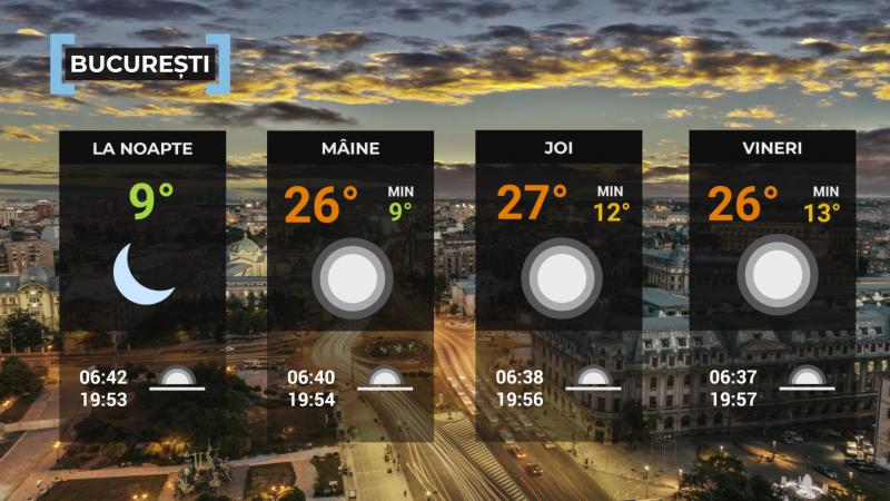 Vremea va fi în continuare frumoasã şi deosebit de caldã pentru aceastã datã. Cerul va fi mai mult senin exceptând în orele nopţii nordul Moldovei şi al Carpaţilor Orientali, unde vor fi înnorãri şi cu totul izolat posibile ploi slabe, trecãtoare. Vântul va sufla slab şi moderat, cu uşoare intensificãri în sudul Banatului, iar noaptea pe alocuri şi în Moldova. Temperaturile maxime se vor încadra între 17 şi 29 de grade, iar cele minime vor fi cuprinse între 5 şi 13 grade, cu valori mai mici în depresiunile din estul Transilvaniei, spre 0 grade. Presiunea atmosferică va fi variabilã în prima parte a intervalului, apoi va fi în creştere.