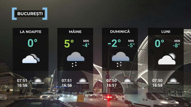 În București, cerul va fi mai mult noros, iar temporar vor fi precipitații predominant sub formă de ninsoare. Se va depune strat de zăpadă, mai ales noaptea, în jurul a 5 cm. Vântul va sufla slab și moderat. Temperatura maximă se va situa în jurul valorii de 4 grade, iar cea minimă va fi de -5...-4 grade.