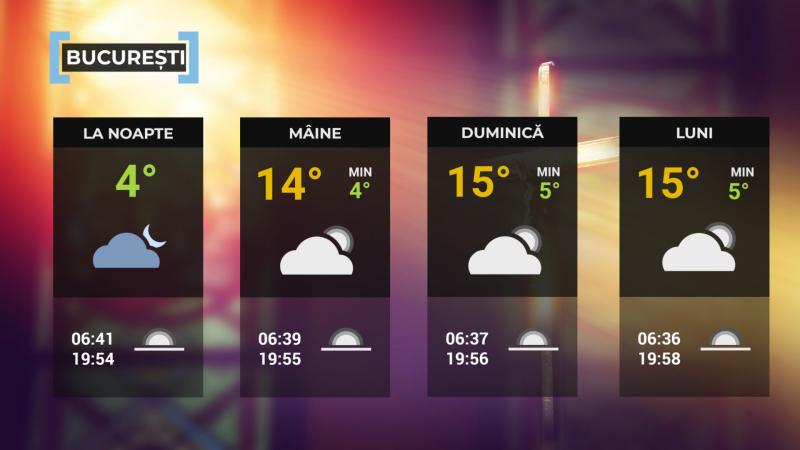 Vremea va fi rece, cu o temperatură minimă de 1...4 grade. Cerul va fi variabil, iar vântul va sufla slab până la moderat.