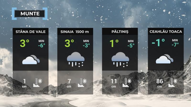 Valorile termice, îndeosebi cele diurne, vor crește ușor în mare parte din țară, însă se vor situa în continuare sub cele specifice datei. Cerul va fi temporar noros și vor fi precipitații slabe pe arii restrânse în Oltenia, Muntenia, Dobrogea, Moldova, Transilvania și în zona montană. Acestea vor fi mai ales ninsori la munte, mixte în zona subcarpatică și sub formă de ploaie în rest, iar în regiunile estice trecător va fi și măzăriche. Vântul va sufla slab și moderat. Temperaturile maxime se vor încadra între 7...8 grade în estul Transilvaniei și izolat 16 grade în sud-vestul Olteniei, iar cele minime vor fi cuprinse între -5 grade în depresiunile Carpaților Orientali și 6 grade pe litoral. Izolat noaptea se va forma ceață, dar și brumă îndeosebi în vest, centru și nord.