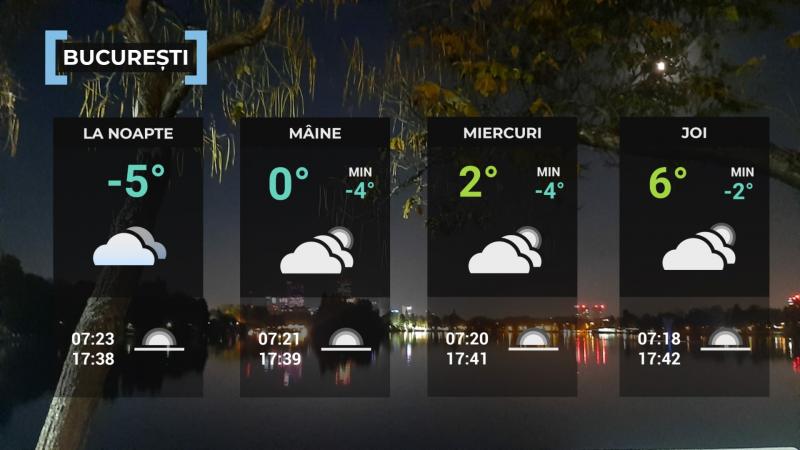 Vremea va fi rece. Va fi nebulozitate joasã dimineaţa şi din nou pe parcursul nopţii, iar dupã-amiaza cerul va fi temporar noros. Vântul va sufla slab şi moderat. Temperatura maximã va fi de -1...0 grade, iar cea minimã se va situa în jurul a -5 grade. Presiunea atmosferică va fi usor variabilã.