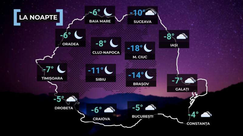 La noapte, vremea va fi rece, local geroasã în Transilvania, Moldova, nordul Munteniei şi al Olteniei şi izolat în celelalte zone. Cerul va fi mai mult senin, cu nebulozitate joasã în estul şi sudul ţãrii, unde izolat vor fi posibile fulguieli. Vântul va sufla slab şi moderat, cu uşoare intensificãri pe litoral şi în sudul Banatului, cu rafale în general de 40...50 km/h. Temperaturile minime vor fi cuprinse între -18...-17 grade în depresiunile Carpaţilor Orientali şi -4...-2 grade pe litoral şi în Dealurile de Vest.