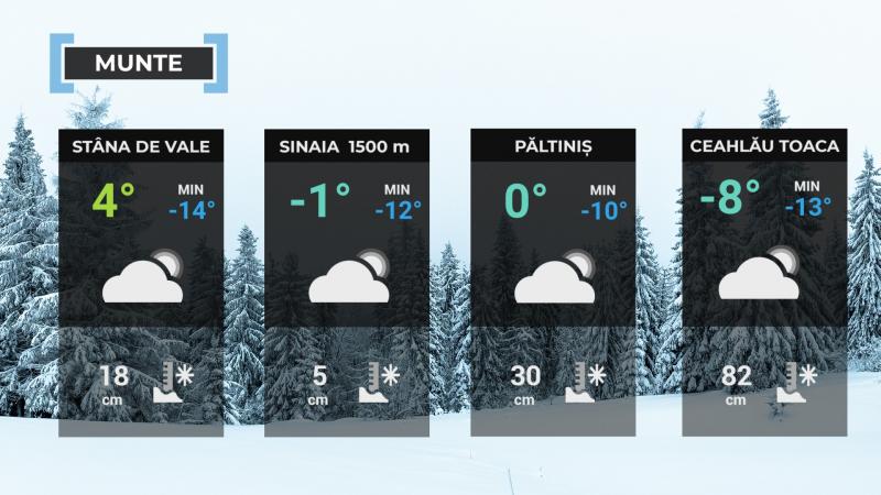 La noapte, vremea va fi rece. Treptat se va forma nebulozitate joasã, iar vântul va sufla slab pânã la moderat. Temperatura minimã va fi de -8...-5 grade.