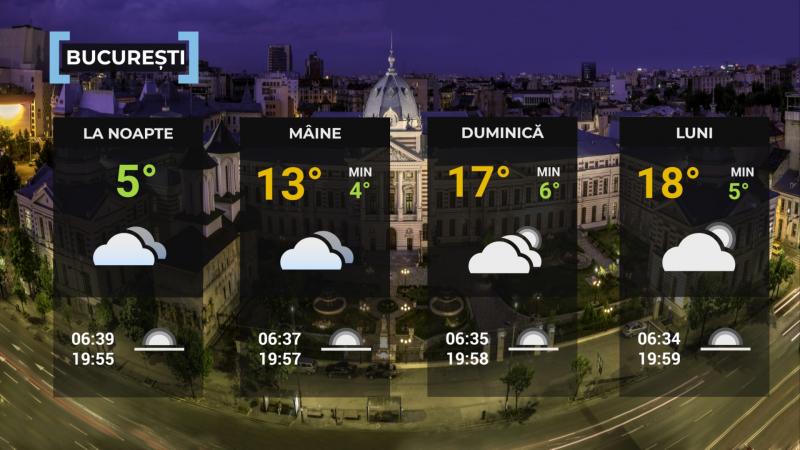 Valorile termice diurne vor creşte faţã de intervalul anterior în cea mai mare parte a ţãrii, dar vor fi în continuare sub mediile climatologice specifice datei. Pe parcursul zilei vor fi înnorãri şi pe arii restrânse ploi slabe, dar noaptea cerul se va degaja treptat, iar aria ploilor se va restrânge în sudul teritoriului. La munte local vor fi precipitaţii mixte şi condiţii de polei. Vântul va sufla slab şi moderat, cu intensificãri în prima parte a intervalului în est, sud-est şi sud-vest (40...50 km/h), precum şi pe crestele montane, cu rafale de 55...65 km/h temporar viscolind ninsoarea. Temperaturile maxime vor fi cuprinse între 6 grade în estul Transilvaniei şi 18 grade în vestul Olteniei; minimele termice vor fi preponderent negative în nord, centru şi vest unde pe alocuri se va produce brumã şi îngheţ la sol şi se vor situa, la nivel naţional, între -4 şi 6 grade, posibil mai scãzute în depresiunile Carpaţilor Orientali. Pe areale mici se va forma ceaţã. Presiunea atmosferică va fi usor variabilã în partea de vest, iar în restul ţãrii va fi în creştere.