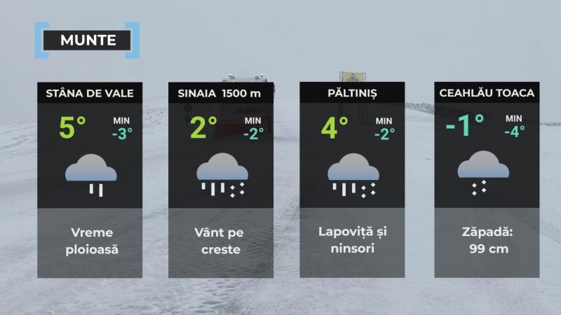 Pe parcursul zilei vor fi înnorãri şi local precipitaţii slabe, mixte, iar noaptea cerul se va degaja treptat, iar aria precipitaţiilor va fi în restrângere. Vântul va sufla slab şi moderat, cu intensificãri pe parcursul zilei în zona înaltã cu rafale de 55....65 km/h, unde temporar ninsoarea va fi viscolitã. Valorile termice vor fi în creştere faţã de ziua precedentã, dar în continuare se vor situa sub cele specifice datei.