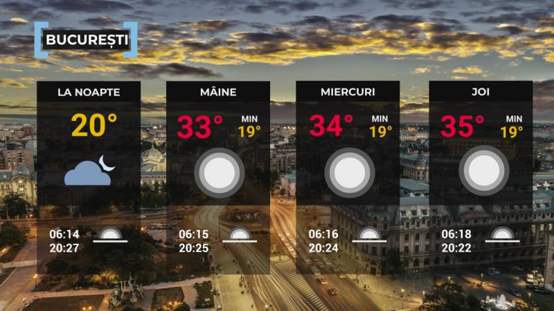 Vremea va fi cãlduroasã în majoritatea zonelor, iar în sudul Banatului şi al Olteniei, precum şi în sud-vestul Transilvaniei şi al Munteniei, izolat va fi canicularã, condiţii în care disconfortul termic va fi ridicat, iar indicele temperaturã-umezealã (ITU) va atinge pragul critic de 80 de unitãţi. Cerul va fi mai mult senin, exceptând zona montanã unde va fi variabil, cu înnorãri temporar accentuate dupã-amiaza şi seara, când izolat vor fi condiţii pentru ploi de scurtã duratã. Vântul va sufla slab şi moderat, local cu uşoare intensificãri ziua în regiunile sudice, iar noaptea doar în sudul Banatului. Temperaturile maxime vor fi cuprinse între 25 şi 35 de grade, iar cele minime se vor situa între 11 şi 22 de grade, mai scãzute în depresiunile din estul Transilvaniei spre 8 grade. Presiunea atmosferică va fi usor variabilã în sud şi est, iar în restul ţãrii va fi în scãdere ziua şi va creşte seara şi noaptea.